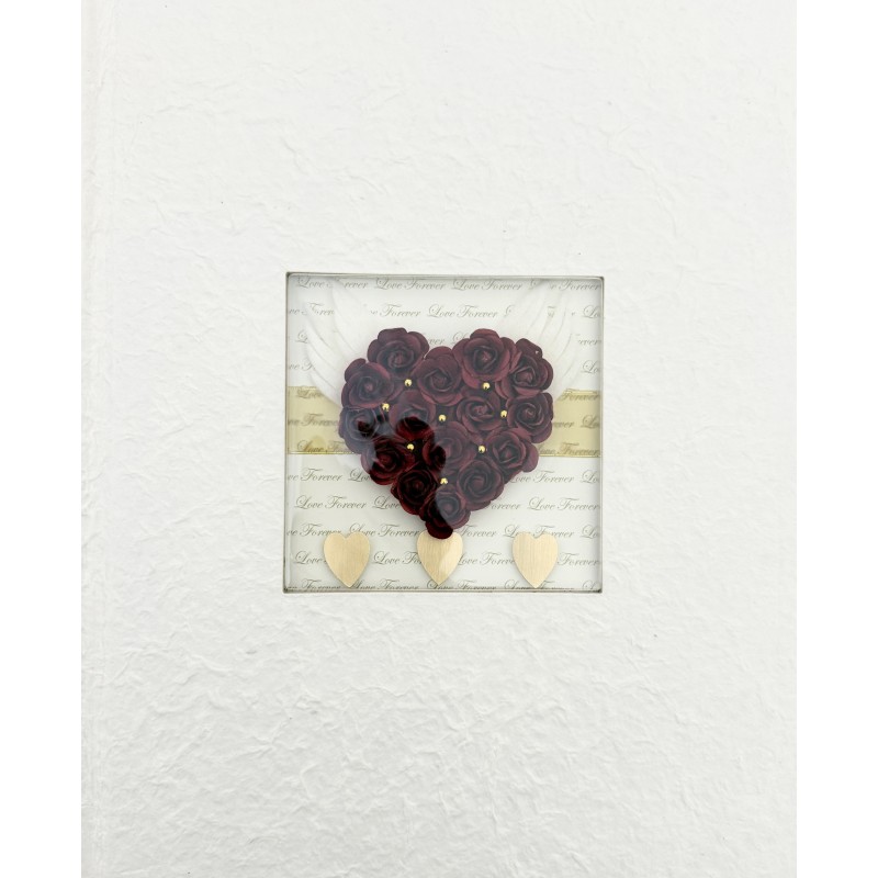 Centralnym elementem okładki jest ozdobna aplikacja z motywem serca ułożonego z czerwonych róż, wzbogacona delikatnymi skrzydłami oraz subtelnymi złotymi akcentami. Tło z romantycznym napisem „Love Forever” nadaje całości ciepły, sentymentalny wyraz.