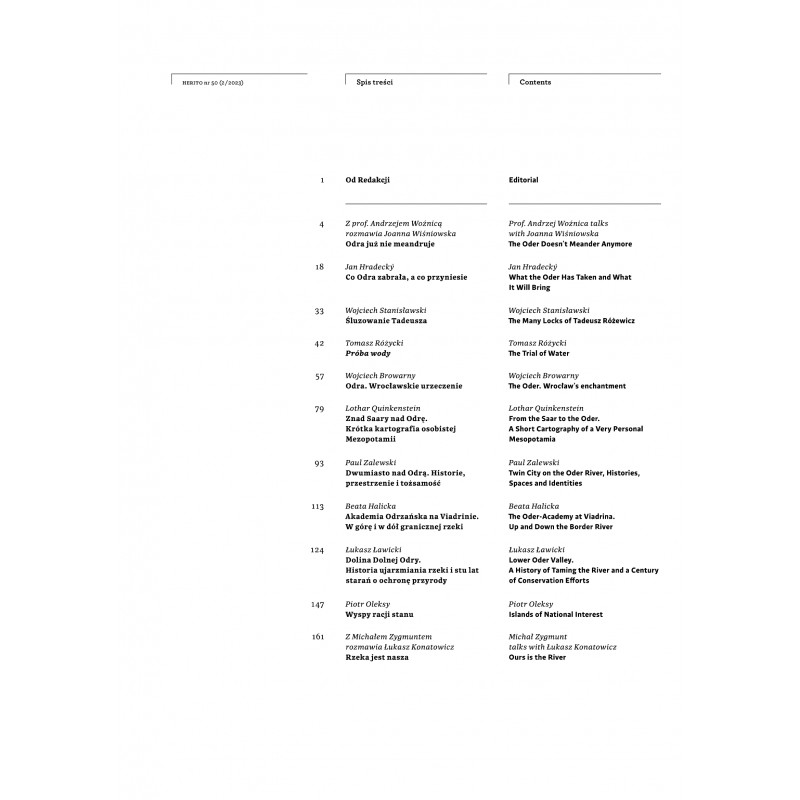 W czasie gdy Ren był bohaterem utworów Heinego czy Wagnera, Odrę skracano, przycinano i prostowano pod ludzkie potrzeby. Miała zasilać nie młyny pruskiej mitologii, lecz huty i spichlerze państwa Fryderyka II Wielkiego. Odra stała się kręgosłupem i główną arterią jego królestwa, mostem łączącym dwa brzegi, i dopiero po hekatombie II wojny światowej pierwszy raz w swej historii zaczęła pełnić funkcję granicy. Jednak w przeciwieństwie do Dunaju stała się też rzeką bez pamięci, której historię trzeba napisać i opowiedzieć od nowa, co w tym numerze czynią: Wojciech Browarny, Beata Halicka, Jan Hradecký, Łukasz Ławicki, Piotr Oleksy, Lothar Quinkenstein, Tomasz Różycki, Wojciech Stanisławski, Andrzej Woźnica, Paul Zalewski, Michał Zygmunt.