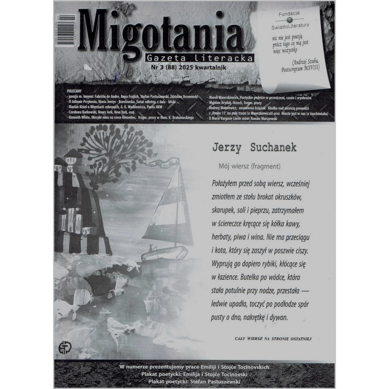 Ukazał się w we wrześniu 2025 roku kolejny, 88 numer kwartalnika „Migotania”, którego objętość jednoznacznie wskazuje, że aby go przeczytać, będzie to oznaczało, jak zwykle, ogromne wyzwanie i konieczność podjęcia wysiłku nie tylko dla wyrobionego czytelnika z „krainy Kochanowskich, Mickiewiczów i Miłoszów” 32 . Imponujący jest bilans teksów opublikowanych przez 23 lata na łamach kwartalnika „Migotania”, który obejmuje między innymi ponad 7200 utworów poetyckich napisanych przez około 500 poetów , blisko 350 fragmentów prozy i opowiadań, ponad 700 esejów, blisko 100 rozmów i wywiadów, prawie 300 rozmaitych tekstów o sztukach wizualnych(teatr, film, fotografia, wideo), niemal 1750 recenzji książek i wydawnictw, w tym około 1000 recenzji tomików i książek poetyckich, oraz ponad 80 niezwykle atrakcyjnych plakatów poetyckich (30 x 42 cm), które pewnością mogły by stanowić interesujące obiekty niezwykle intrygującej wystawy retrospektywnej lub stać się cennym nabytkiem i ozdobą niejednej galerii, muzeum, czy chociażby Domu Literatury.