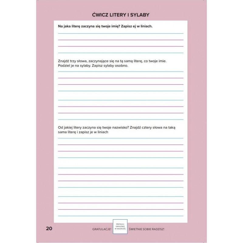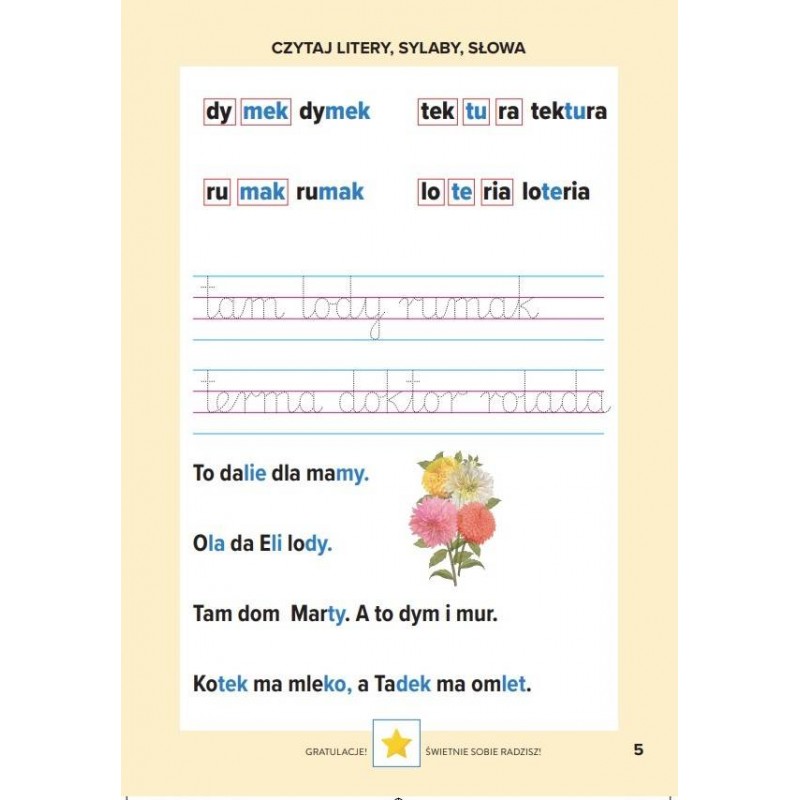 Sprawnie poznaje wszystkie litery alfabetu, polskie dwuznaki (np. sz, cz, dz), słowa, w których występują i przeczyta zdania z użyciem tych słów. Dowie się też jak wygląda zapis liter pisanych i napisze nimi swoje imię i nazwisko.