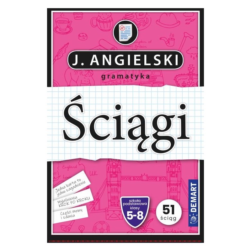 Pakiet 51 dwustronnych, kolorowych, starannie graficznie opracowanych ściągawek obejmuje wszystkie ważne tematy gramatyczne uwzględnione w podstawie programowej, m.in. czasy, tryby,mowę zależną, części mowy i zdania oraz budowę i łączenie zdań.