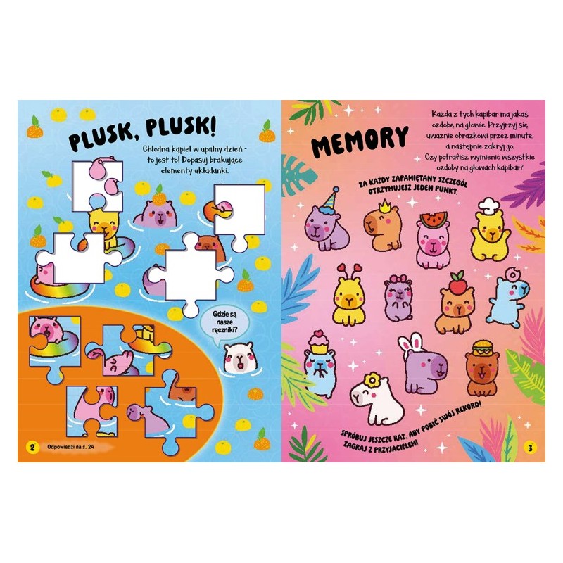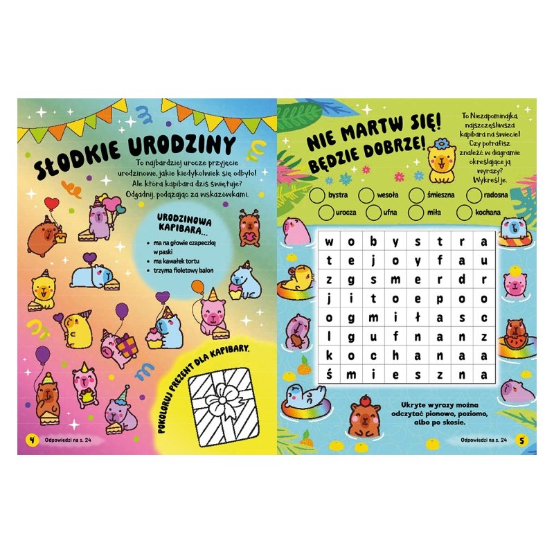 Urocze kapibary to książeczka edukacyjna z serii Słodziaki, stworzona dla dzieci w wieku przedszkolnym. To połączenie zabaw edukacyjnych, atrakcyjnych ilustracji i wypukłych naklejek z kapibarami, które zachęcają do aktywnego odkrywania i nauki przez zabawę.