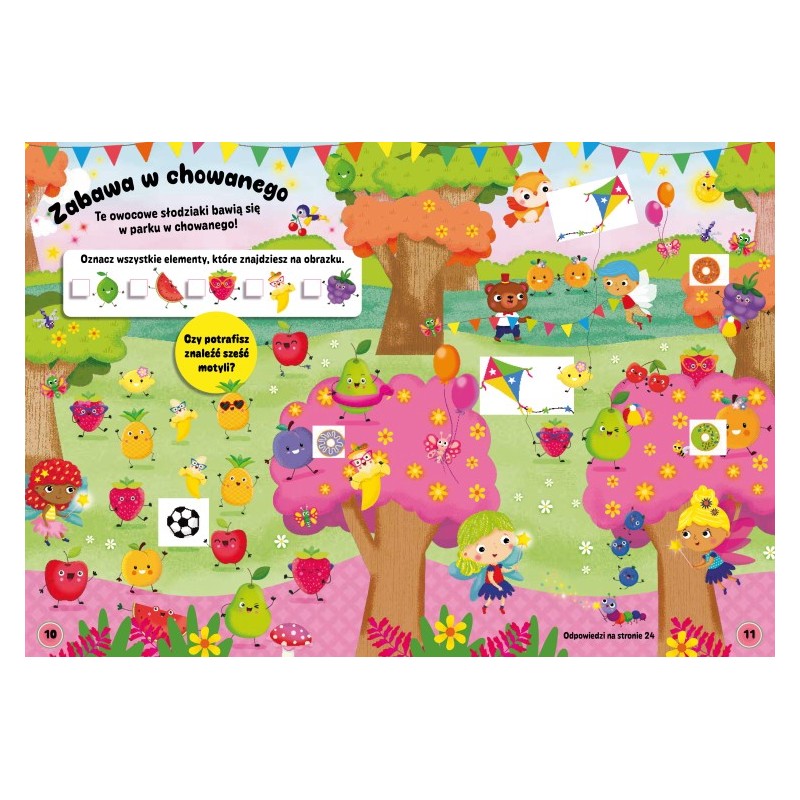 W książce znajdują się pachnące, wypukłe naklejki, wypychanki oraz gry, które zachęcają dziecko do interakcji. Różnorodne zadania, takie jak szukanie różnic, labirynty, rysowanie po śladzie, kolorowanie, łączenie kropek i liczenie, pomagają ćwiczyć koordynację wzrokowo-ruchową, rozwijać spostrzegawczość, a także kształtować logiczne myślenie i kreatywność.