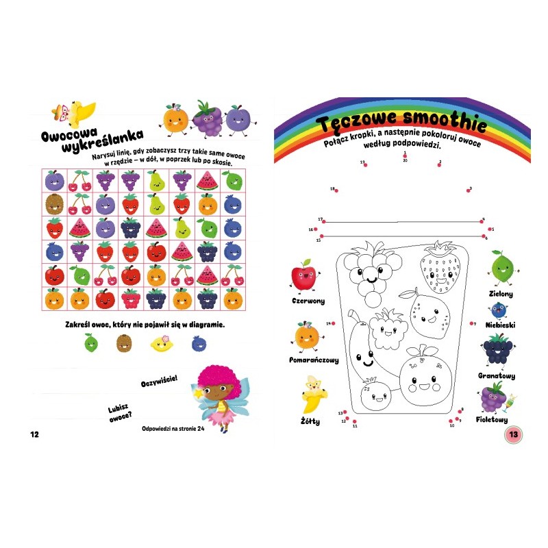 Wesołe ilustracje i sympatyczni bohaterowie w formie kolorowych owoców sprawiają, że nauka staje się przyjemna i angażująca. Książka wspiera również rozwój słownictwa oraz utrwala poznane wcześniej umiejętności.