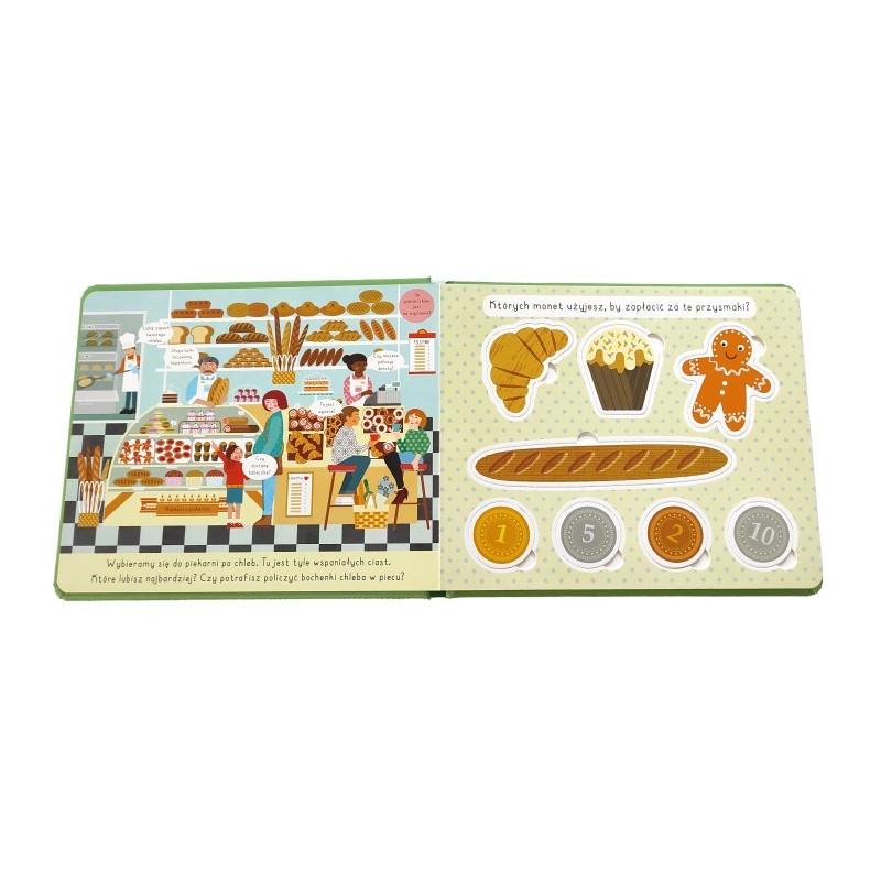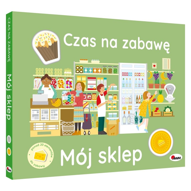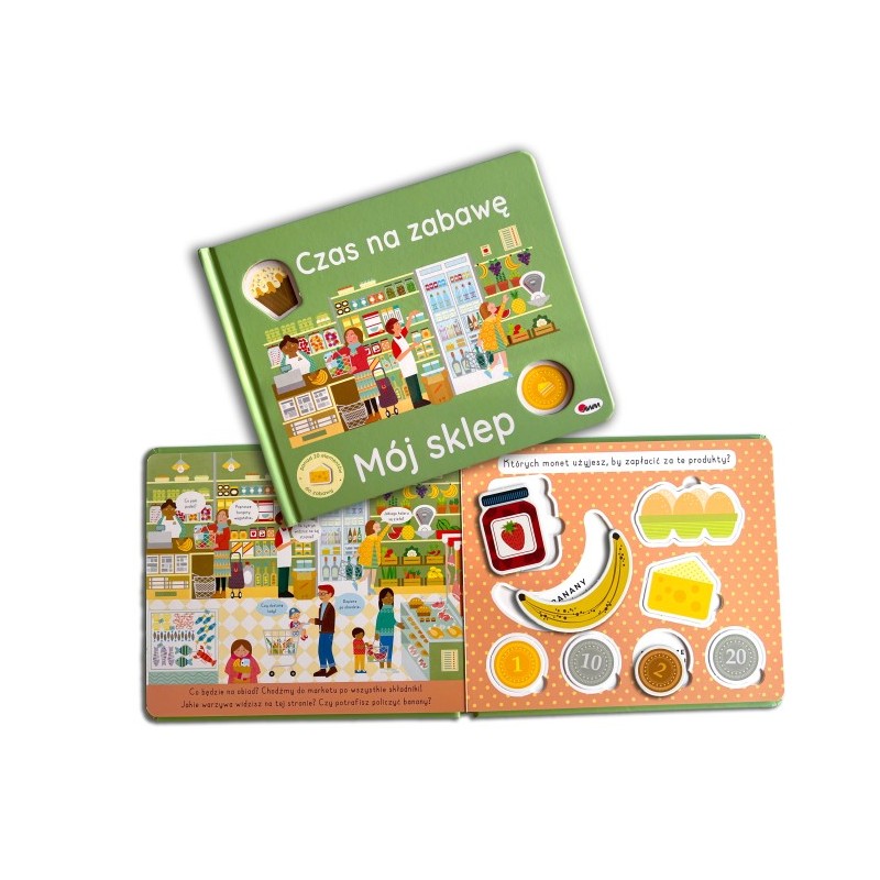 Mój sklep to kartonowa książeczka z wyjmowanymi elementami z serii Czas na zabawę, która pozwala dziecku wcielić się w rolę sprzedawcy lub klienta. W środku znajdują się tekturowe produkty i monety, krótkie teksty, pytania zachęcające do rozmowy oraz przyjazne ilustracje. Książeczka wspiera aktywne czytanie, rozwija wyobraźnię, pomaga w nauce liczenia i wzbogaca słownictwo związane z zakupami.