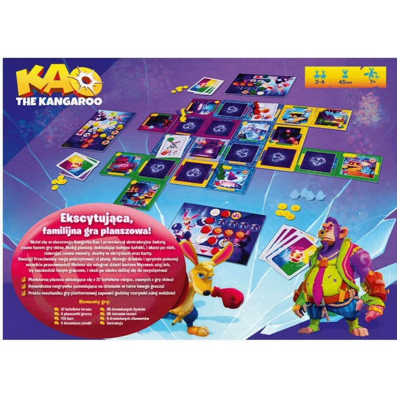 Wciel się w skocznego Kangurka Kao i przemierzaj abstrakcyjne światy, znane fanom gry video. Buduj planszę, dokładając kolejne kafelki, i skacz po nich, zbierając cenne monety, skarby w skrzyniach oraz karty. Uważaj! Przeciwnicy mogą pokrzyżować ci plany, dlatego dzielnie i sprytnie pokonuj wszelkie przeciwności! Możesz się odegrać dzięki kartom Wyzwań: użyj ich, by zaszkodzić innym graczom, i skok po skoku zbliżaj się do zwycięstwa!