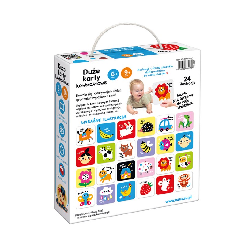 Czy wiesz, że oglądanie kontrastowych ilustracji wspiera harmonijny rozwój wszystkich funkcji poznawczych maluszka? Poręczna, edukacyjna książeczka kontrastowa do pokazywania inspiruje do mnóstwa aktywności z maluchem. Oglądając ilustracje, opowiadając o nich i bawiąc się, wspierasz rozwój i nabywanie kolejnych kompetencji u dziecka, a przede wszystkim budujecie wyjątkową więź. To Wasz czas! Do zestawu dołączyliśmy poradnik z informacjami o rozwoju w pierwszym roku życia i pomysłami na wykorzystanie książeczki.