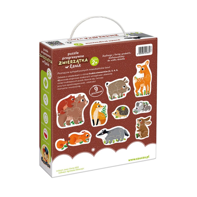 W poręcznym pudełku zamieszkało mnóstwo leśnych zwierzaków: od małych myszek po niedźwiadki. 9 układanek ma różną liczbę elementów: 2, 3, 4, 5 i 6. W ich rozdzieleniu pomogą różne kolory tła na rewersach. Dzieci mogą stopniowo doskonalić sztukę układania coraz trudniejszych puzzli. Piękne ilustracje, duże elementy i forma produktu sprawiają, że zestaw doskonale sprawdzi się jako pierwsze wieloelementowe puzzle dla dzieci.