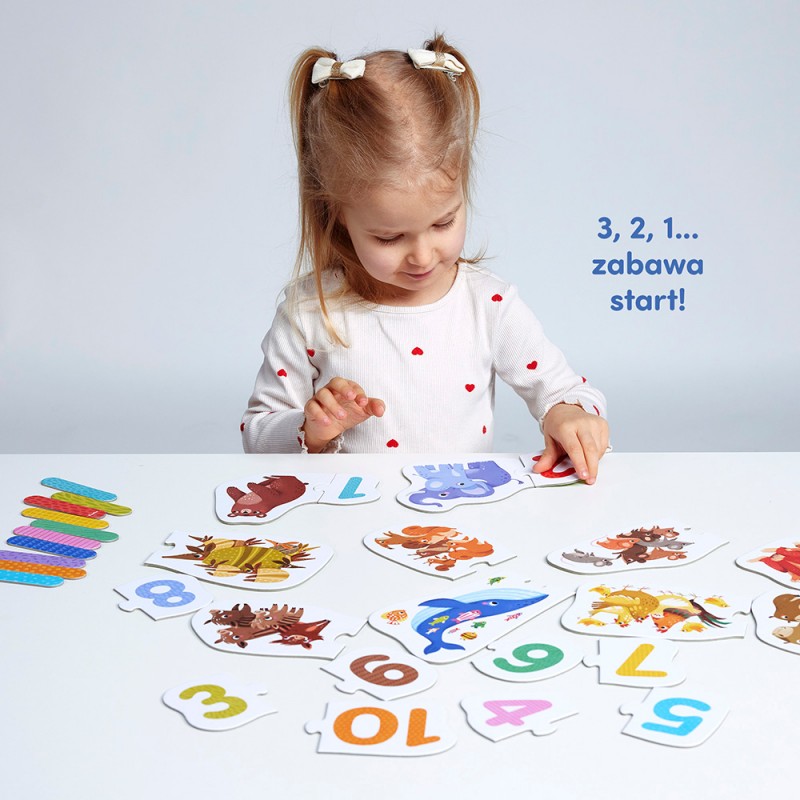 W kolorowym zestawie znajdziecie 10 dużych dwuelementowych układanek, liczmany – kolorowe patyczki do liczenia oraz poradnik pełen pomysłów na mądre zabawy. Układanie puzzli to świetna inspiracja, aby poznawać cyfry oraz uczyć się i doskonalić naukę liczenia do 10.