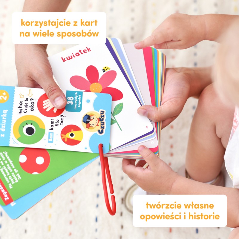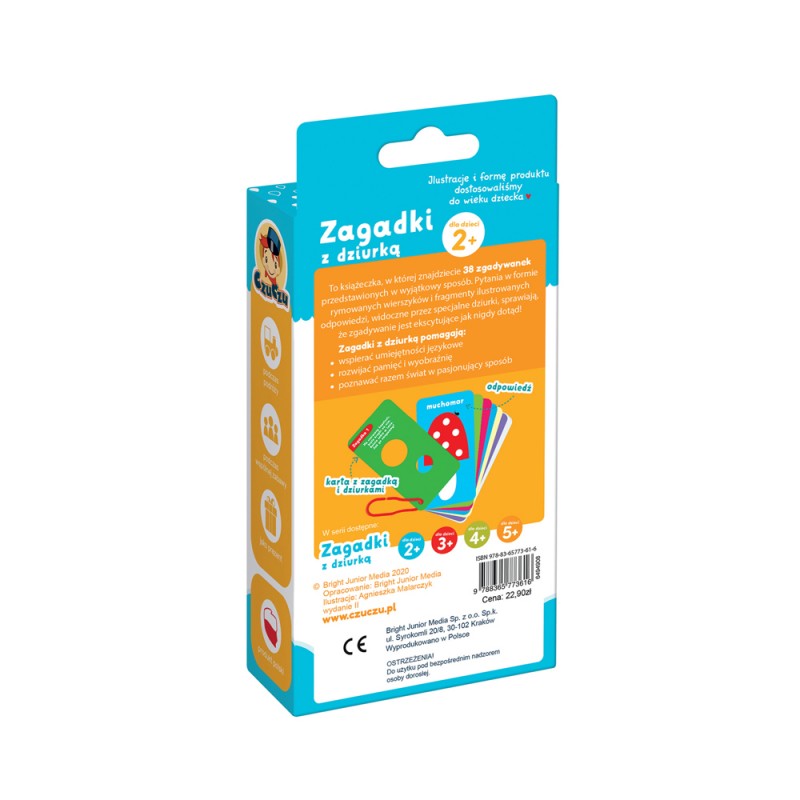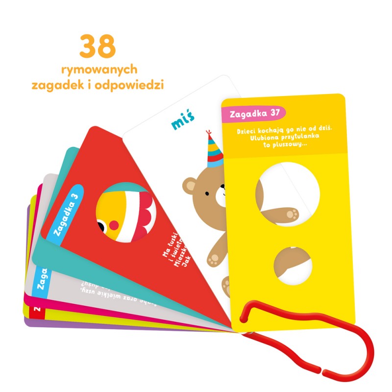W poręcznej, obrazkowej książeczce znajdziecie moc zagadek. Pytania mają formę rymowanych wierszyków, natomiast fragmenty ilustrowanych odpowiedzi widoczne są przez specjalne dziurki. To sprawia, że zgadywanie jest ekscytujące jak nigdy dotąd! Przed wami 38 pytań i odpowiedzi, które poruszają tematy bliskie maluchom. Karty książeczki są spięte wygodną zawieszką.