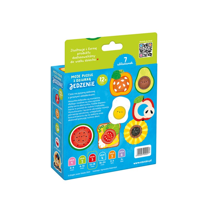Duże, soczyście kolorowe układanki przedstawiają pyszności znane maluchom, co zachęci je do zabawy. Dokładanie kółeczek jest prostsze niż tradycyjnych elementów, można to zrobić do góry nogami lub tył naprzód, dlatego to świetny pomysł na początek przygody z puzzlami.