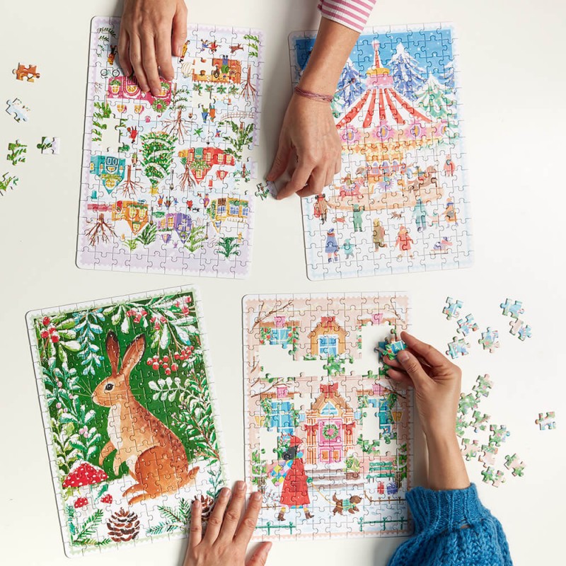 Rozgrzej palce po zimowym spacerze dzięki zestawowi czterech pięknie zilustrowanych układanek, idealnych na tę porę roku. Każda składa się ze 150 elementów, a ich układanie to przyjemne wyzwanie, które pozwoli Ci wyciszyć się lub zrelaksować w ulubionym towarzystwie.