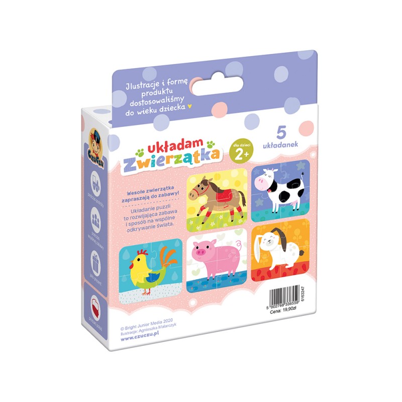 Każdy obrazek składa się z 4 puzzli, dlatego edukacyjny zestaw znakomicie sprawdzi się u maluchów, które początek układania mają już za sobą. Pełne humoru, barwne ilustracje zachęcają dzieci do łączenia elementów i twórczej zabawy. Zobaczcie, że możecie tworzyć także nieoczywiste połączenia. Formę, tematykę i ilustracje układanek dostosowaliśmy do wieku początkujących układaczy. Pojedźmy razem na wieś!