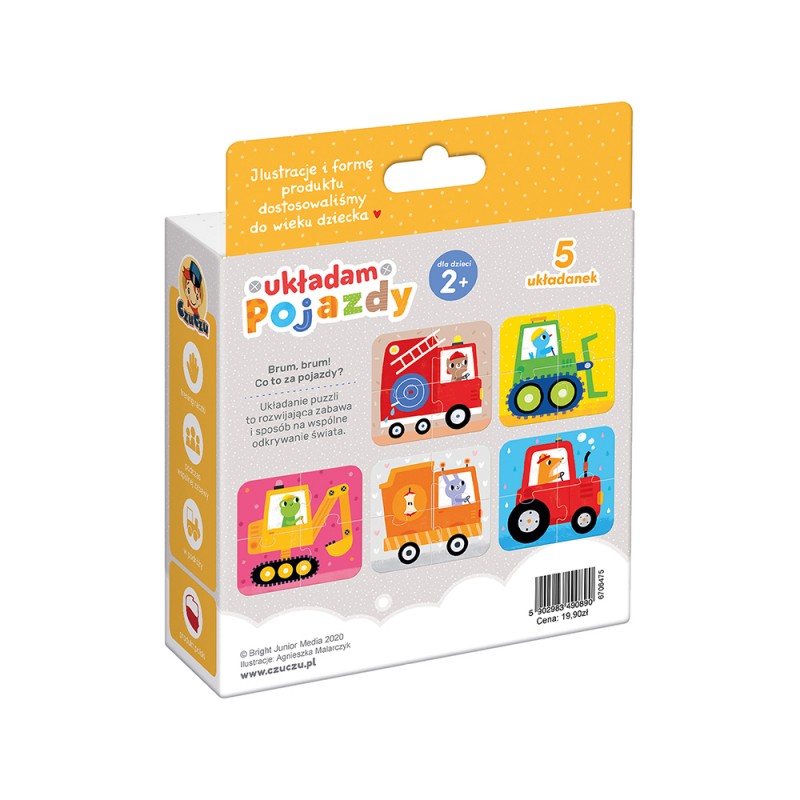 W poręcznym pudełku znajdziecie aż pięć 4-elementowych układanek. Bajkowe ilustracje inspirują najmłodszych do układania, co jest doskonale ćwiczy małe rączki i rozwija spostrzegawczość. Puzzle inspirują do poznawania nazw zwierząt, pojazdów i kolorów, wydawania dźwięków, a nawet zabaw ruchowych – dajcie się ponieść wyobraźni! Mali wielbiciele wielkich maszyn polecają Pojazdy jako pierwsze wieloelementowe puzzle.