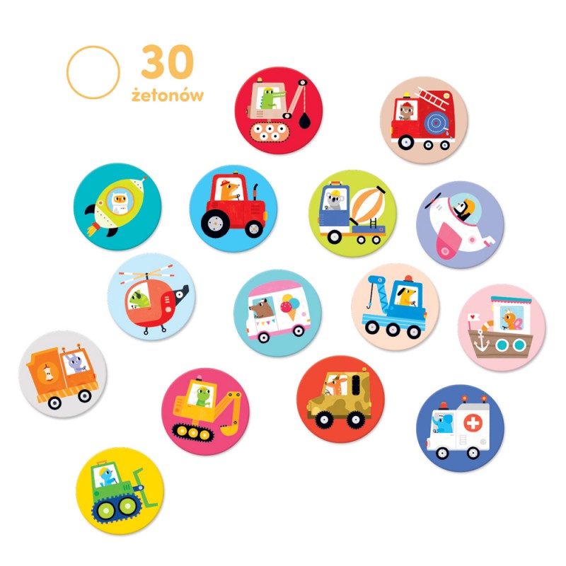 Sympatyczni kierowcy kolorowych pojazdów zapraszają do wspólnej zabawy! Wskakujcie, jedziemy!