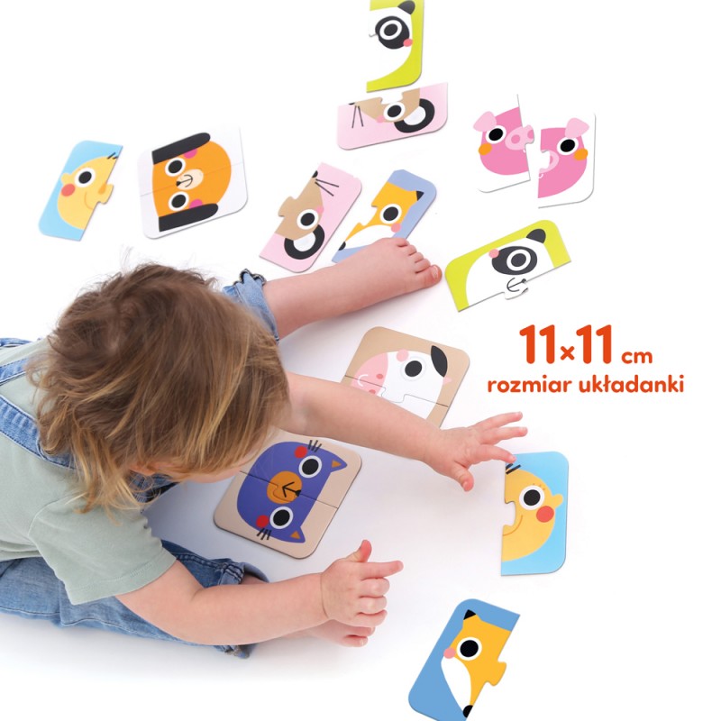 Czas rozpocząć puzzlową przygodę! Dopasujcie do siebie 2 połówki i sprawdźcie, czyja to buzia. Elementy są duże i pasują do małych rączek, a dzięki precyzyjnemu wykonaniu ułożone puzzle nie rozłączają się. Przyjazne ilustracje o stonowanej kolorystyce i poziomie szczegółowości zachęcają maluchy do zabawy.