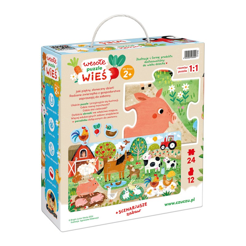 Ciekawy świata maluch codziennie chłonie nową wiedzę, co naturalnie najlepiej przychodzi mu przez zabawę. Dobrze wiemy, że przyjazne zwierzątka, szczególnie z gospodarstwa, to uwielbiani bohaterowie dziecięcych zabaw. Wesołe puzzle Wieś to pomysł na mądry prezent, który zainspiruje do mnóstwa rozwijających aktywności.