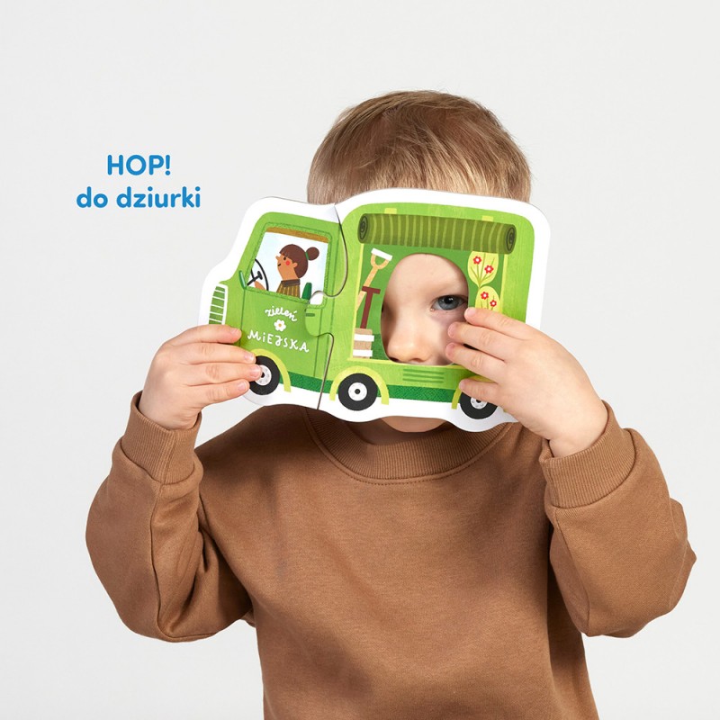 Układanki o rosnącej liczbie elementów (od 2 do 4) zapraszają najmłodszych układaczy do kolejnego etapu puzzlowej przygody. Kto poprowadzi karetkę, a kto wóz zieleni miejskiej? Wskakujcie do śmieciarki albo policyjnej furgonetki. Można też ruszyć tramwajem. Poznajcie kolorowe pojazdy i ruszajcie do akcji!