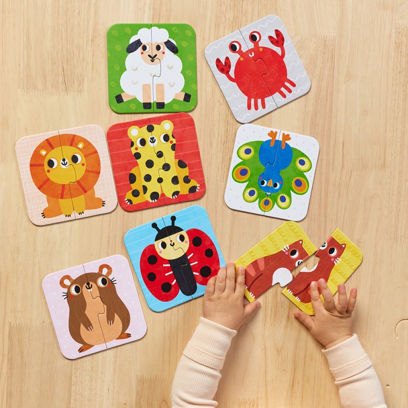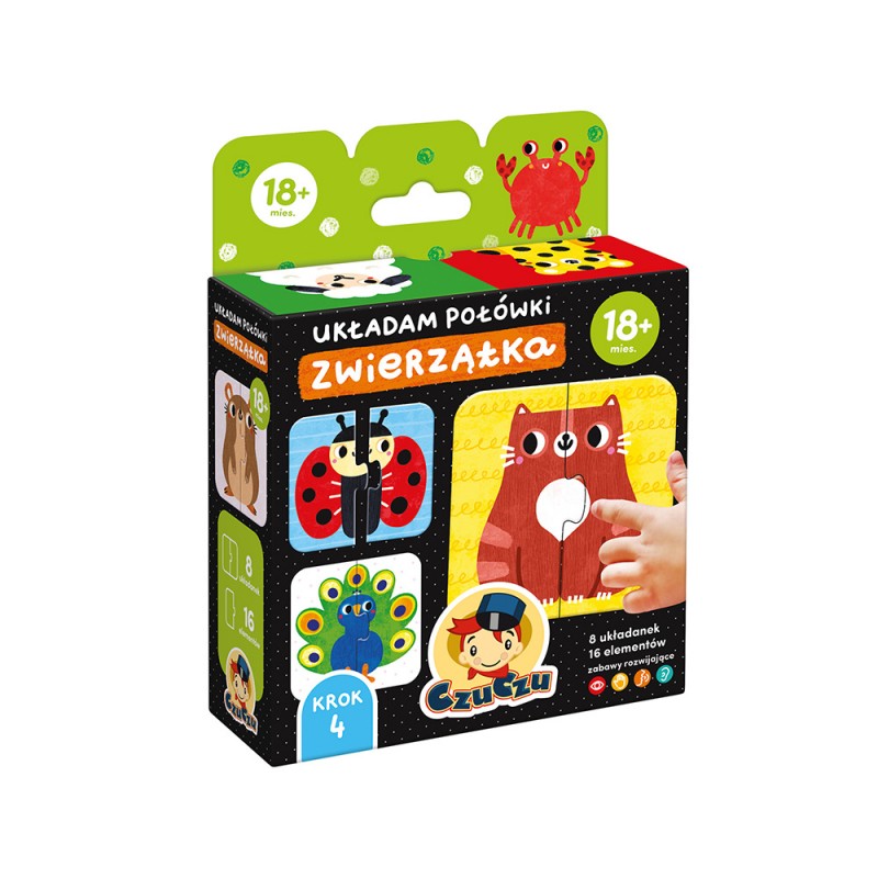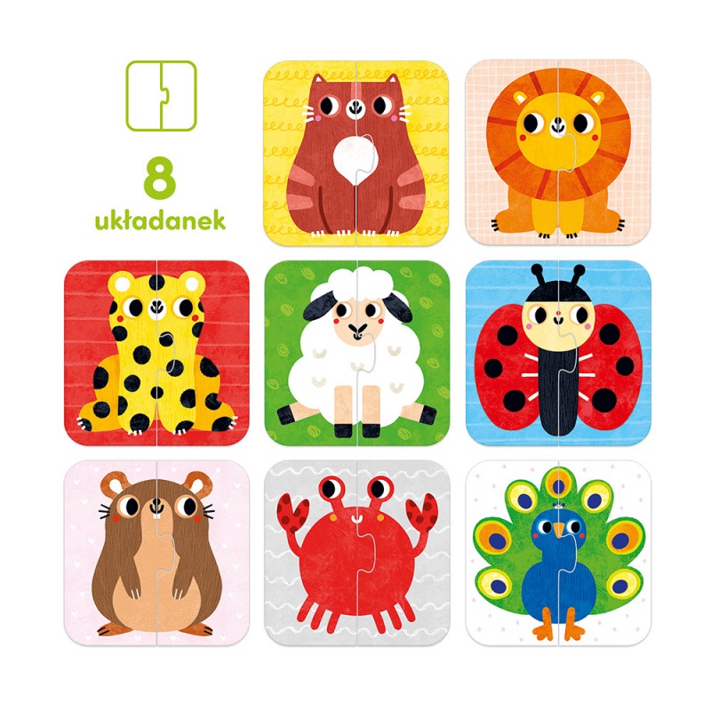 Edukacyjne dwuelementowe układanki sprawdzą się doskonale jako pierwsze puzzle z tradycyjnymi łączeniami. Zabawa polega na odnalezieniu i dopasowaniu symetrycznych połówek. Elementy są duże i pasują do małych rączek. Bawcie się na różne sposoby: nazywajcie zwierzątka, naśladujcie ich odgłosy i ruchy, narysujcie własne.