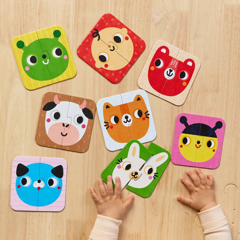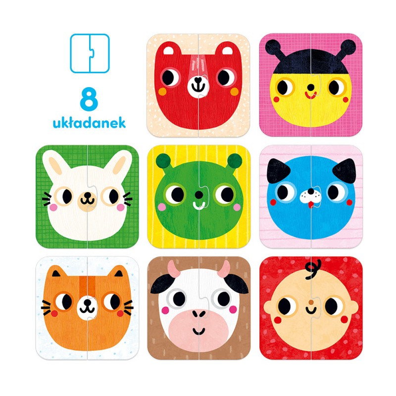 Edukacyjne dwuelementowe układanki sprawdzą się doskonale jako pierwsze puzzle dla maluszków. Elementy są duże i pasują do małych rączek. Zabawa polega na znalezieniu i dopasowaniu pasujących symetrycznych połówek. Nazywajcie postacie i kolory na ilustracjach i bawcie się, tworząc nieoczywiste połączenia.