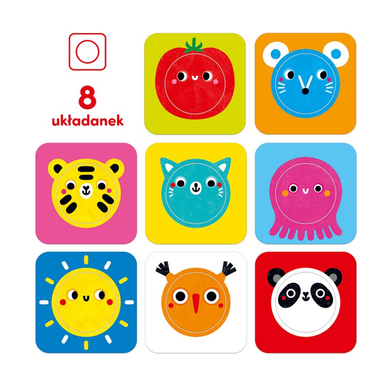 Edukacyjny zestaw składa się z dużych tabliczek z wyjmowanymi kółeczkami. Zabawa polega właśnie na ich dopasowywaniu, przy czym można je dokładać tył na przód, pod różnym kątem, pomiędzy tabliczkami a nawet… wypstrykiwać, dlatego to doskonały pomysł na pierwsze układanki dla roczniaków. Kolorowe ilustracje i formę puzzli dopasowaliśmy do wieku ciekawych świata maluchów. Zabawa kołem się toczy!