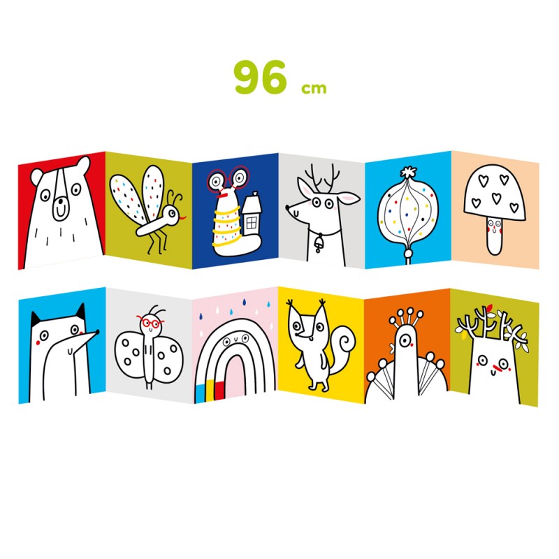 W kreatywnym zestawie znajdziecie 2 długie książeczki harmonijki, a w nich ponad dwadzieścia ilustracji z grubymi konturami, dostosowanymi do wieku małych artystów. Tematyka zachęca maluchy do sięgania po kredki i podejmowania prób rysowania. Maluchy potwierdzają: twórczy zestaw inspiruje i doskonale sprawdza się jako pierwsze kolorowanki.