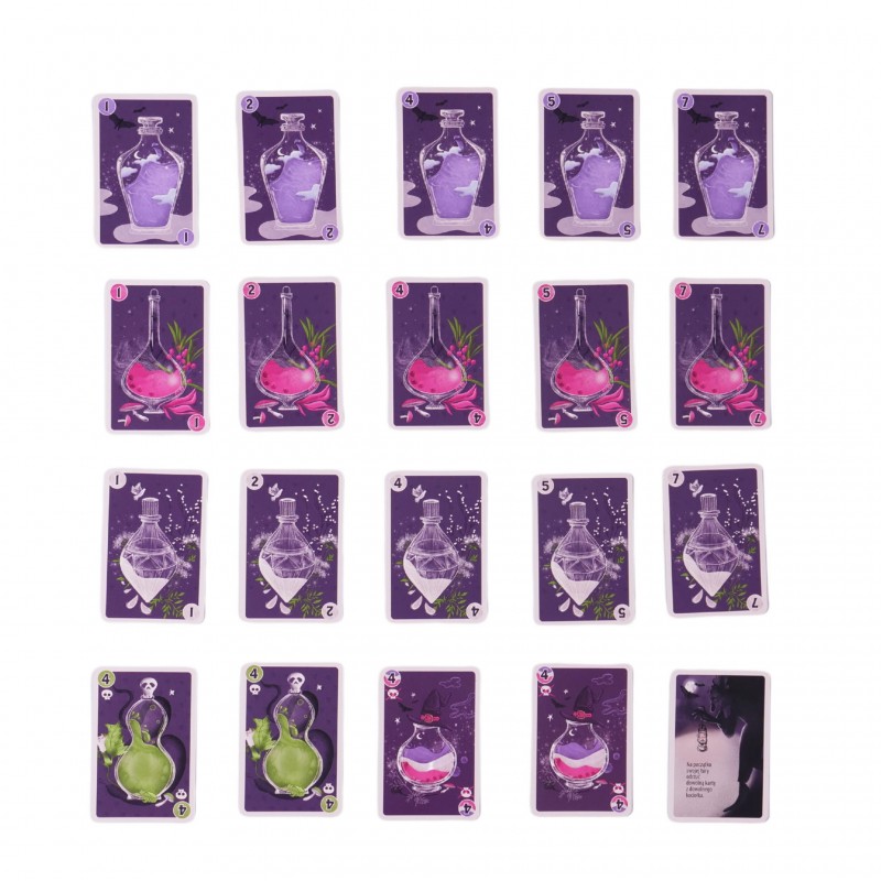 Zagrywaj karty eliksirów, ale uważaj by nie przelać kociołka! – jeśli łączna wartość kart w kociołku przekroczy 13, będziesz musiał je zebrać… Każda zebrana karta eliksiru na koniec rundy warta jest 1 punkt. Zwycięzcą zostanie gracz, który będzie miał najmniej punktów na koniec rozgrywki!