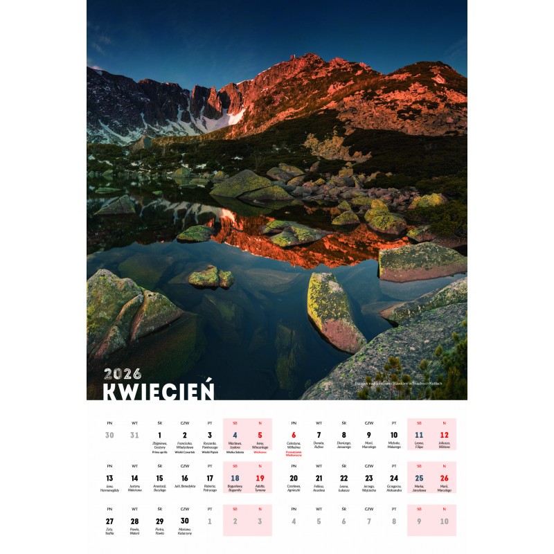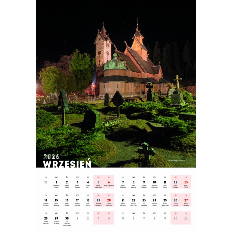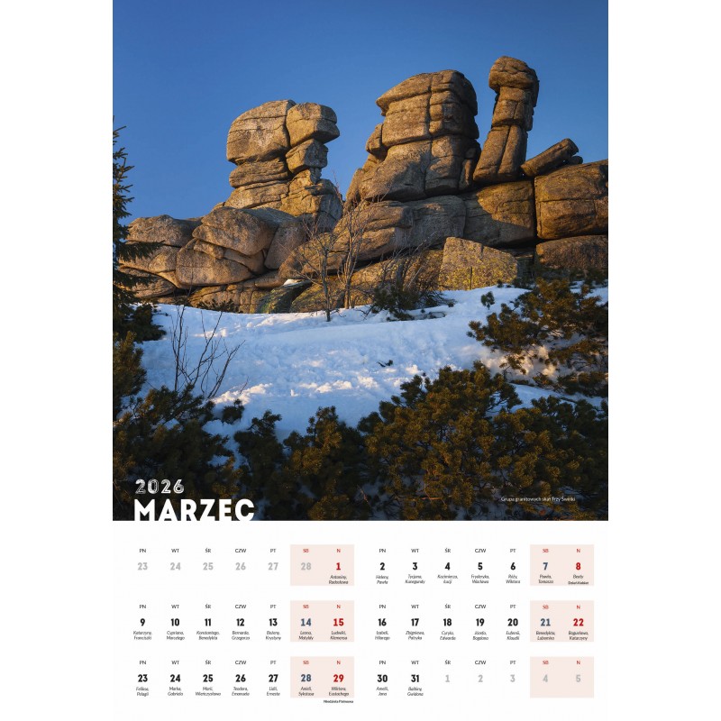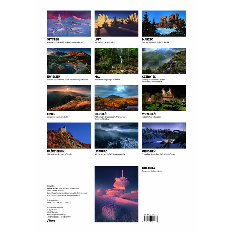 Wieloplanszowy kalendarz „Karkonosze 2026” zawiera ujęcia z tego najwyższego i najatrakcyjniejszego pasma Sudetów – malownicze wodospady, słynne Śnieżne Kotły, świątynię Wang w Karpaczu, usytuowany na szczycie góry średniowieczny zamek Chojnik, zadziwiające formacje skalne, a także górującą nad nimi Śnieżkę.