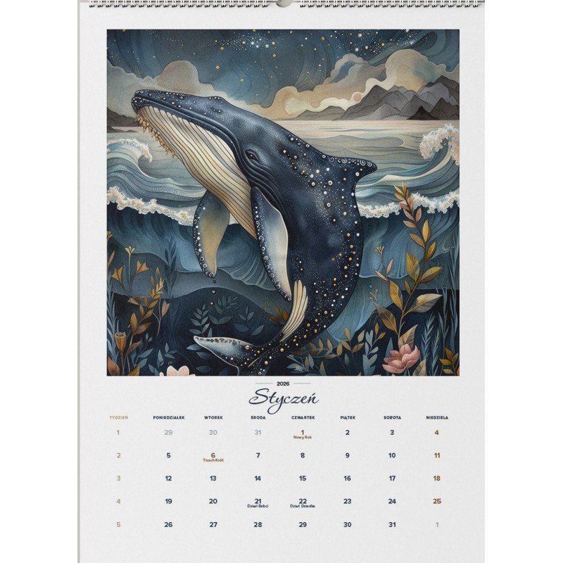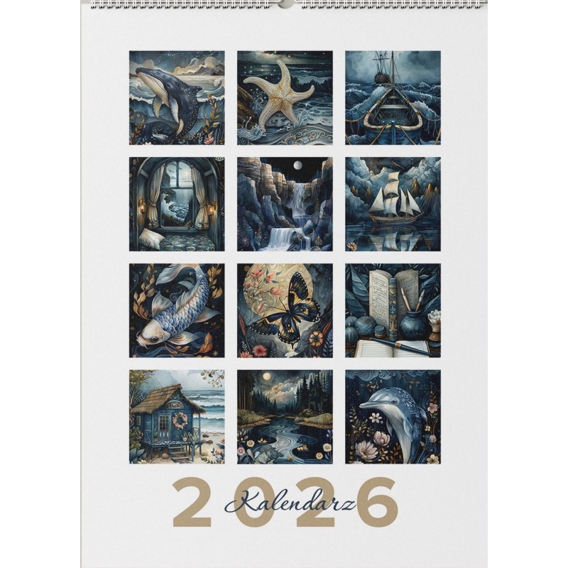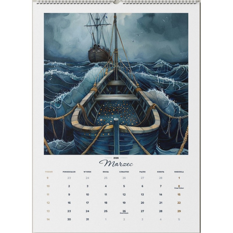 Wieloplanszowy kalendarz ścienny - zawiera 12 plansz z grafikami morskimi. Projekt Szymon Kołosowski