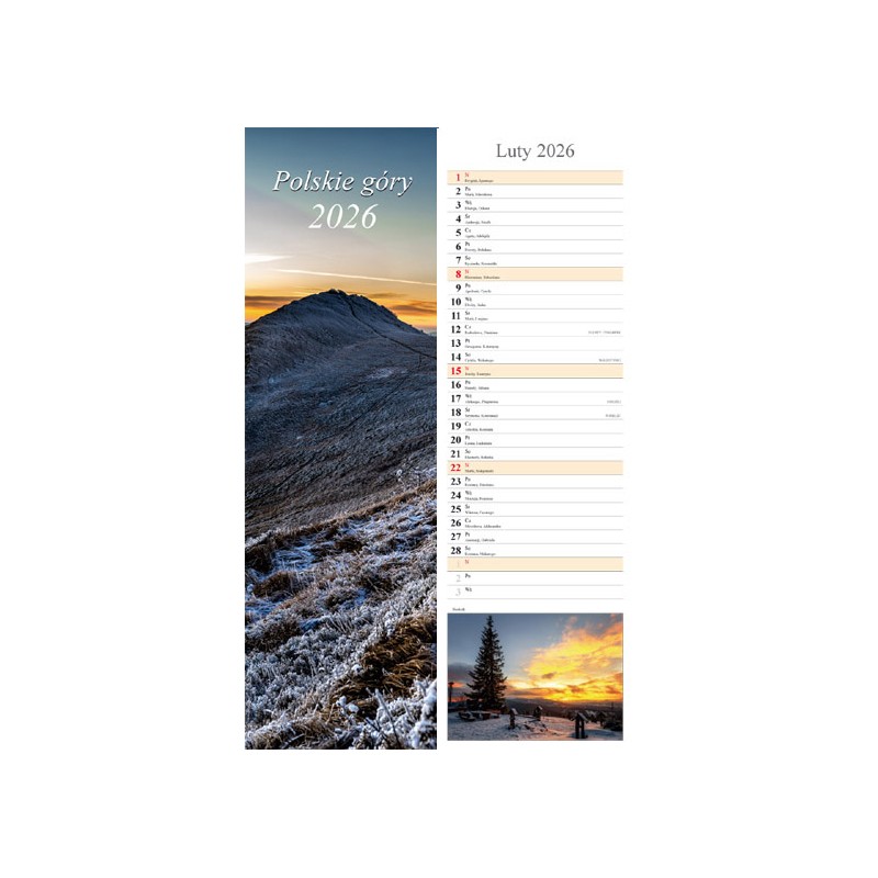Kalendarz ścienny, wieloplanszowy, zawierający dwanaście kart (miesiąc na stronie) plus okładka pokryta lakierem UV, spięte spiralą zamykaną, wraz z drucianą zawieszką.