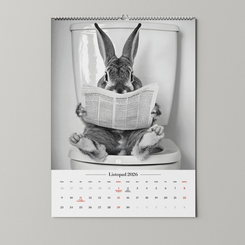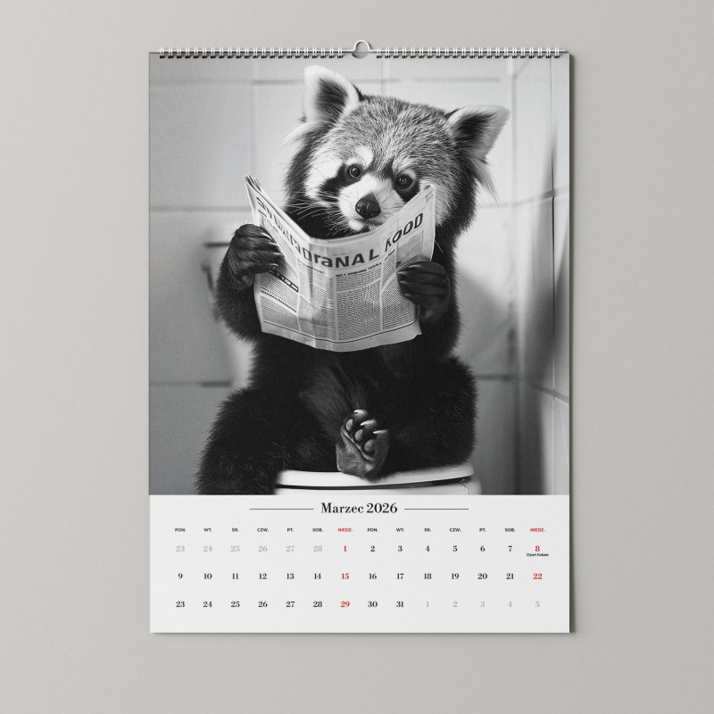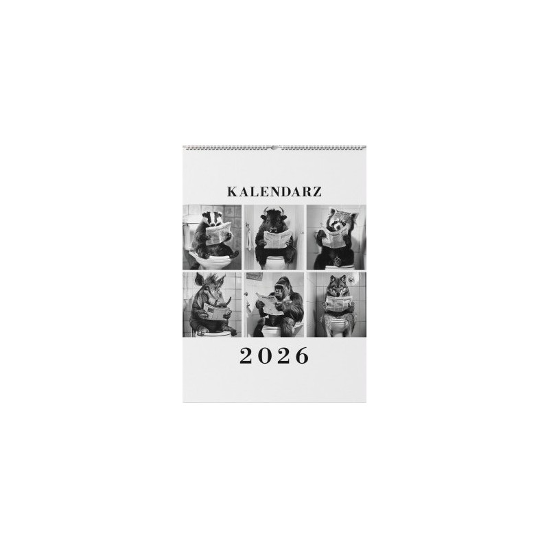 Wieloplanszowy kalendarz ścienny - zawiera 12 zabawnych plansz ze zwierzakami w toalecie.