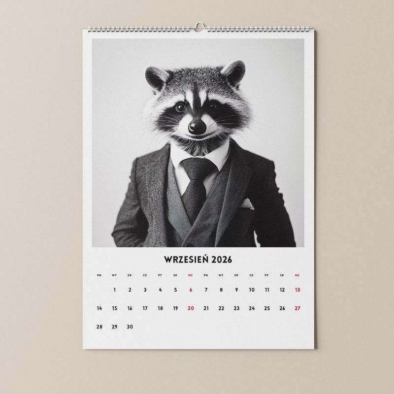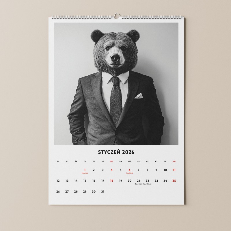 Wieloplanszowy kalendarz ścienny - zawiera 12 plansz ze zabawnymi wizerunkami zwierząt w garniturach. Niezbędny w każdym biurze i urzędzie...