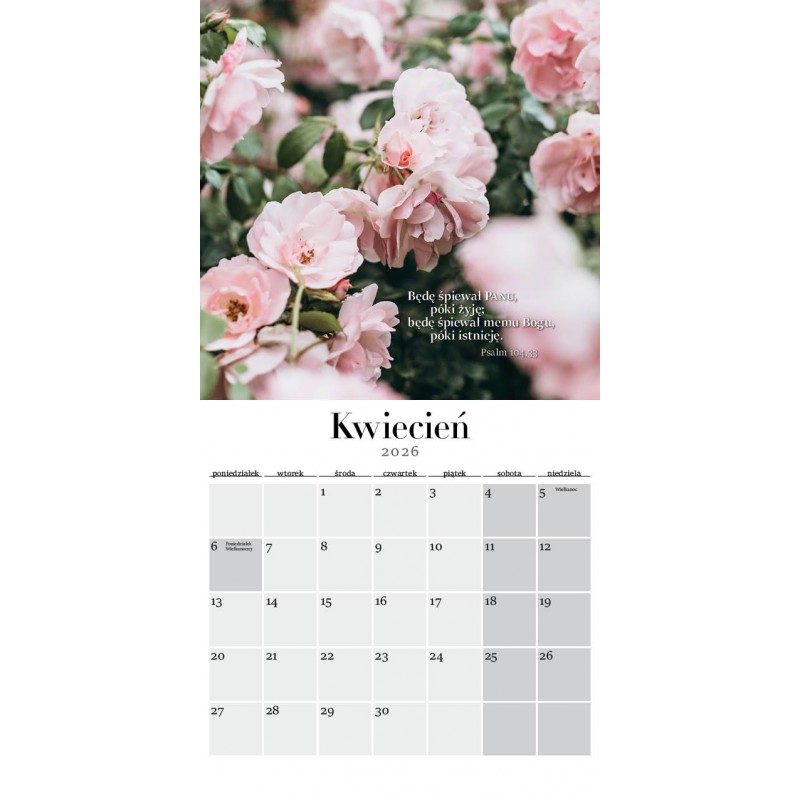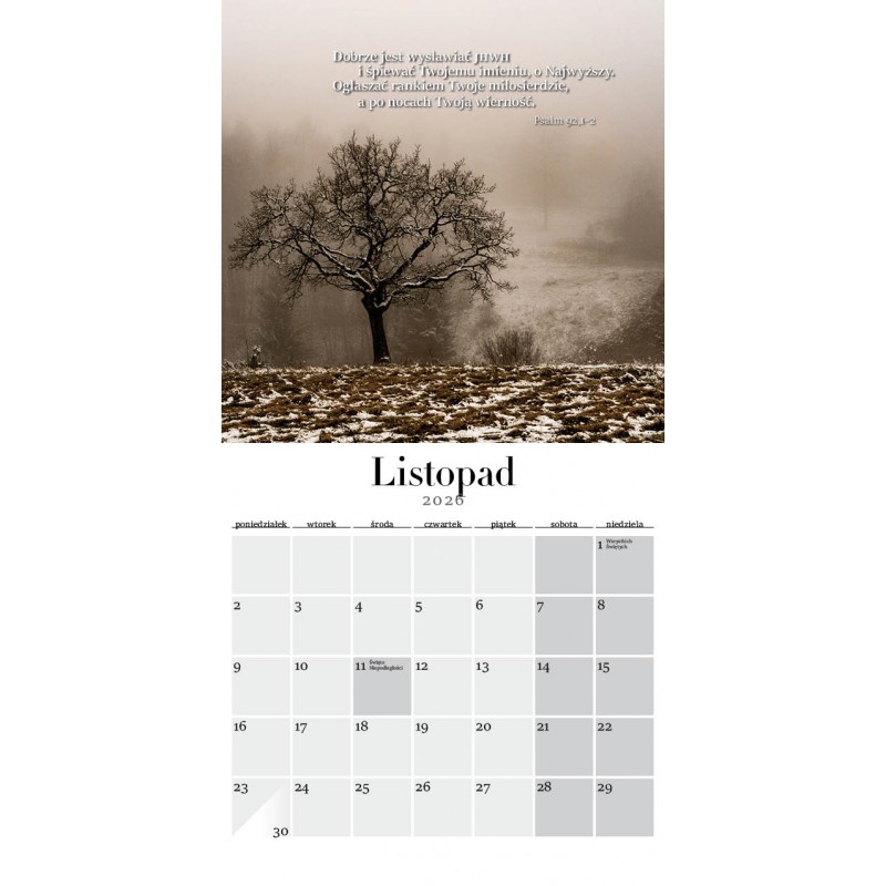 Kalendarz ścienny z psalmami. Tym razem motywem przewodnim przepięknych zdjęć prezentowanych na papierze kredowym jest piękno przyrody. Każdy miesiąc znajduje się na osobnej stronie, a obrazowi towarzyszą cytaty z Księgi Psalmów. Tradycyjnie zadbaliśmy o to, by znalazło się dużo miejsca na notatki.