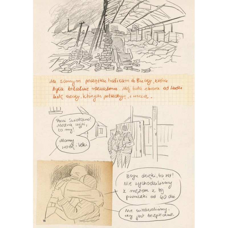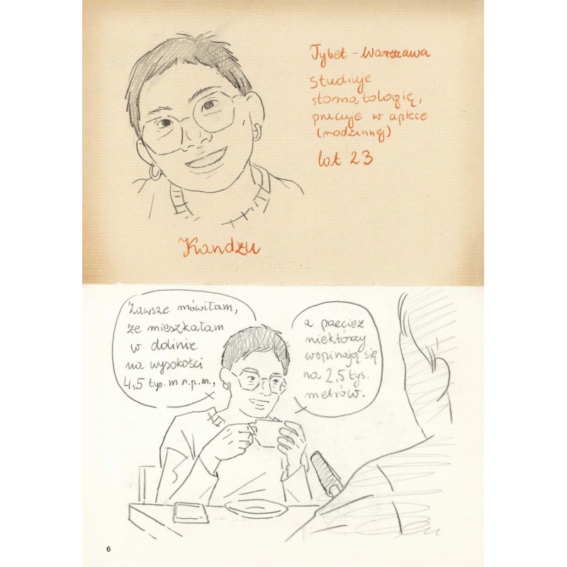 Punktem wyjścia dla rysowniczki było jej własne doświadczenie migracyjne w Wielkiej Brytanii, w książce poznajemy jednak losy osób uchodźczych, które w Polsce znalazły nowy, bezpieczny dom: młodej Kandżu, wychowanej w koczowniczej rodzinie w okupowanym Tybecie, zaadoptowanej przez polskie małżeństwo, które potem pomagało na granicy polsko- białoruskiej i w Buczy; białoruskiej uchodźczyni Marii; algierskiego studenta odesskiego uniwersytetu, Housama, który trafił do Polski w następstwie pełnoskalowej wojny w Ukrainie; oraz Nadii, Ukrainki z Donbasu, z córeczkami, które uciekły już po pierwszej wojnie w 2014 roku.