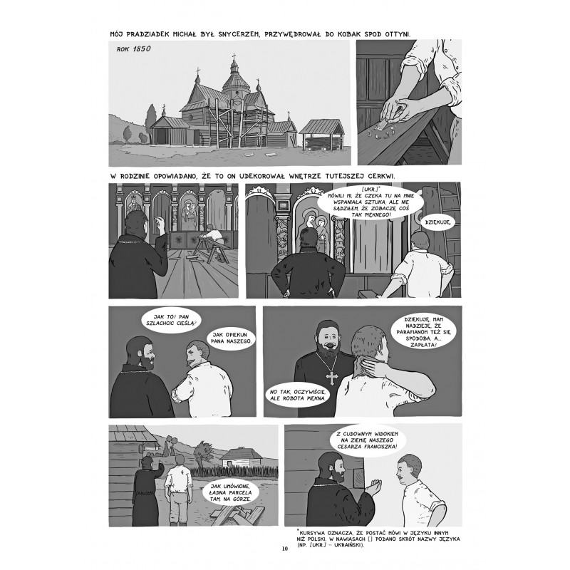 W centrum tej opowieści autor umieszcza swojego dziadka Mikołaja Jaskółowskiego. Nie jest to klasyczny literacki czy komiksowy bohater, z którym chciałoby się utożsamić. Bliżej mu wręcz do antybohatera. Porywczy, niesprawiedliwy, nadpobudliwy, brutalny. Ktoś, kto naznacza swoją rodzinę traumą na następne pokolenia. Ale też urodzony gawędziarz, skarbnica rusińskich bajek, pieśni, przypowieści i powiedzonek. Utalentowany samouk, ponadprzeciętnie pracowity, spostrzegawczy i bystry.