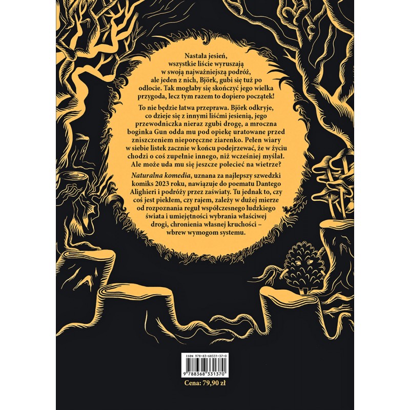 Ulla Donner tworzy opowieść przenikniętą uniwersalnymi prawdami i rytmem życia, a jednocześnie bardzo nam bliskimi współczesnymi niepokojami. „Naturalna komedia”, uznana najlepszym szwedzkim komiksem 2023 roku, nawiązuje do poematu Dantego Alighieri i podróży przez zaświaty. Tu jednak to, czy coś jest piekłem, czy rajem, zależy w dużej mierze od rozpoznania reguł współczesnego ludzkiego świata i umiejętności wybrania właściwej drogi, chronienia własnej kruchości – wbrew wymogom systemu.
