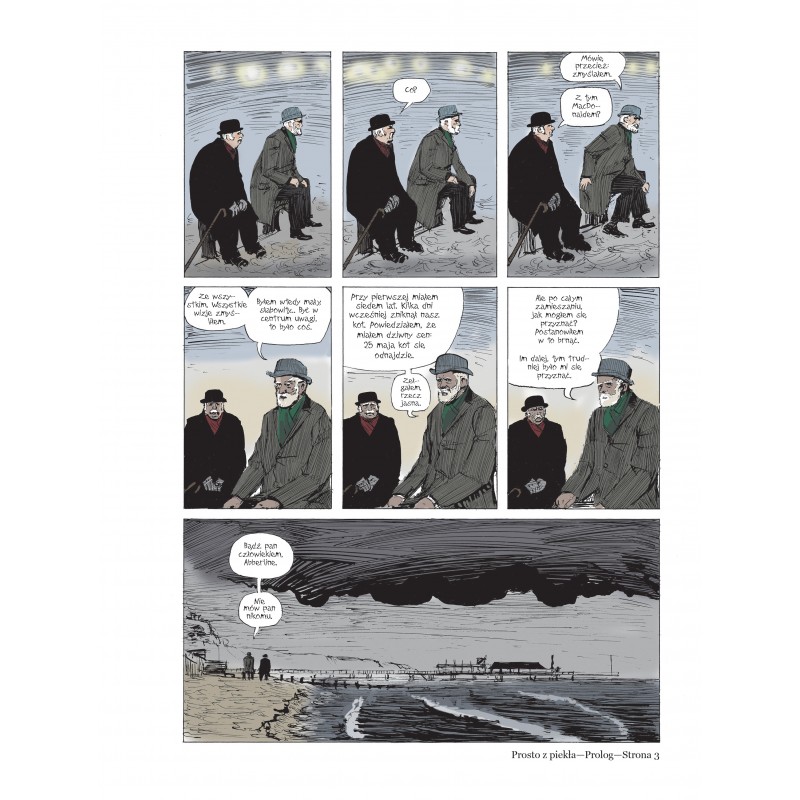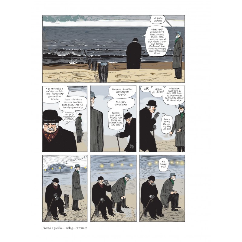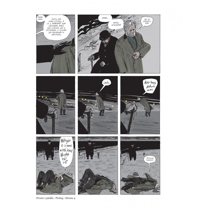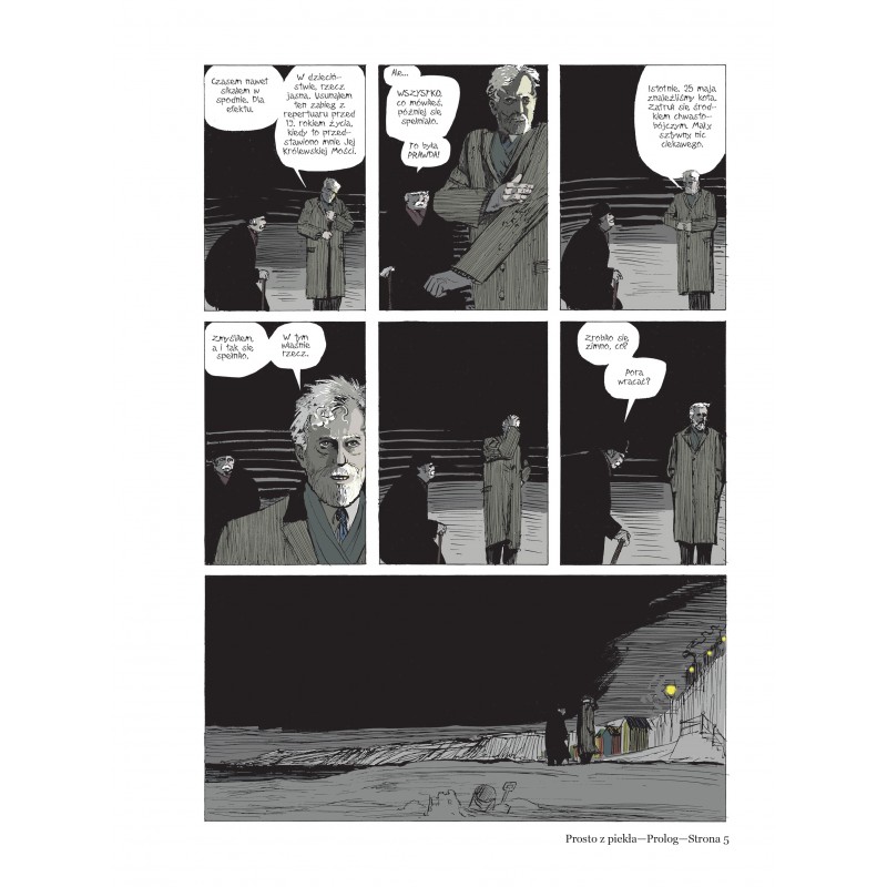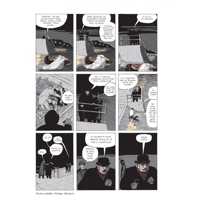 Teraz kolor zawitał do Polski! Prosto z piekła to historia Kuby Rozpruwacza, prawdopodobnie najbardziej znanego seryjnego mordercy w historii. „Janko Rozpruwacz”, „Jack emboweler” (jak pisano o nim w „Kurjerze Codziennym” w 1888 r.) zyskał swą niesławę morderstwami pięciu prostytutek na londyńskim East Endzie. Czy tamte wydarzenia były preludium do krwawego XX wieku? Prawie sto lat później angielski scenarzysta komiksowy Alan Moore, odczuwający potrzebę oderwania się od klasycznego komiksu, postanowił zestawić fakty i mity o morderstwach w Whitechapel w formie powieści graficznej, przygotowując się do tego ze skrupulatnością naukowca. Moore mówi o swojej pracy: „Wierzę, że jeżeli wgryziesz się w historię wystarczająco mocno, jeżeli tniesz precyzyjnie, uporczywie, i postępujesz metodycznie, wtedy jesteś w stanie nie tylko pokazać wewnętrzny mechanizm rzeczy, ale również i ich sens…”. Rzeczywiście – przemyślany i trzymający w napięciu scenariusz Moore’a i dynamiczna oprawa graficzna Eddiego Campbella porywają czytelnika w podróż w czasie, po powrocie z której trzeba będzie raz jeszcze zadać sobie pytanie o to, co na tym świecie jest prawdziwe, a co fałszywe.