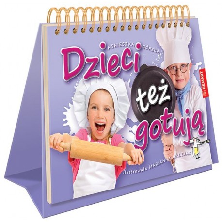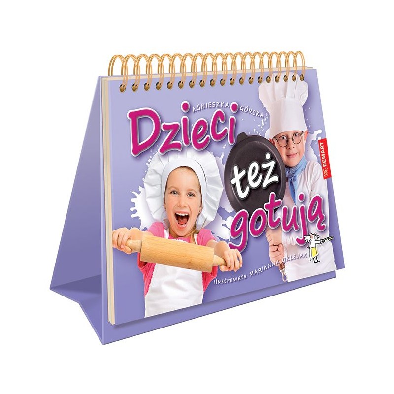 „Dzieci też gotują” to kulinarna książka dla dzieci w innowacyjnej formie wydania. Jest oprawiona jak stojący kalendarz na biurko, dzięki czemu w trakcie gotowania przepis jest cały czas widoczny w całości! 61 przepisów pogrupowano w trzy działy: „Na zimno”, „Na ciepło”, „Na słodko”.