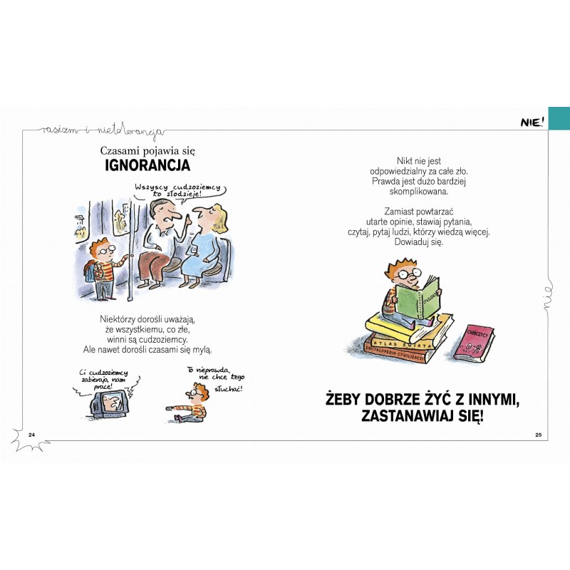 Książka tłumaczy czym jest rasizm, pokazując, że każdy z nas ma prawo do szacunku. Uczy świadomego podejścia do bycia ciekawym, otwartym i tolerancyjnym. Oswaja z uczuciami, które możemy odczuwać, spotykając się z innością – zdziwieniem, zakłopotaniem, agresją, ignorancją , nieufnością i nienawiścią. Pokazuje, jak te uczucia oswoić i co zrobić, aby stać się otwartym na inność drugiego człowieka . Pomaga lepiej żyć razem. Uczy także, że rasizm jest przestępstwem ! Prosta forma graficzna , rysunki i krótkie teksty sprawia, że już najmłodsze dzieci mogą same ją czytać Dla rodziców,nauczycieli i wychowawców może być przydatnym wsparciem w rozmowie.