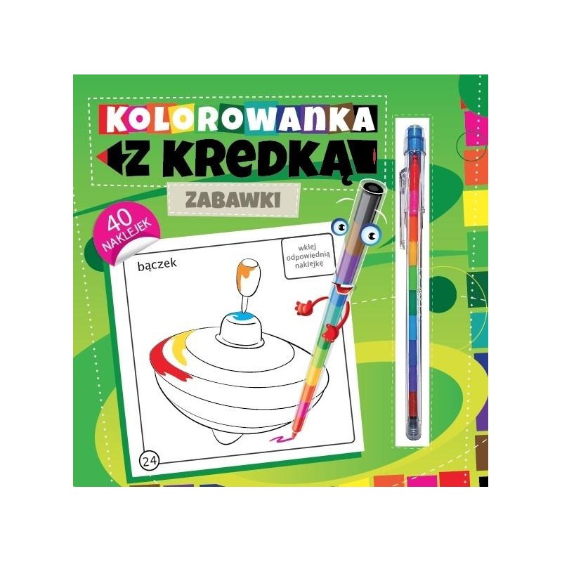 Zawierają dodatkowo 40 naklejek oraz segmentową kredkę z kolorowymi rysikami (11 kolorów).