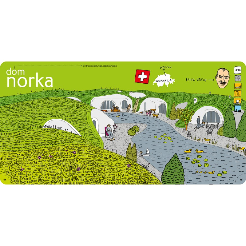 Dowcipne, soczyście kolorowe rysunki i zwięzłe, przystępne opisy prezentują 35 niezwykłych domów stworzonych przez najwybitniejszych architektów świata, takie jak dom zasłonka Shigeru Bana, dom winda Rema Koolhaasa, dom żagiel Emilia Ambasza, dom 4x4 Tadao Ando czy domek dla bezdomnych Krzysztofa Wodiczki.