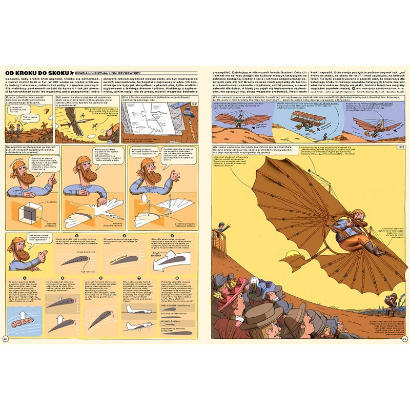 Spotkacie tu całą galerię uczonych, wynalazców i konstruktorów: tych z odległej przeszłości, jak Leonardo da Vinci czy bracia Montgolfier, tych bliższych naszym czasom, jak bracia Wright czy Otto Lilienthal, i tych całkiem współczesnych, którzy wciąż mają nowe, niesamowite pomysły. Przyjrzycie się, jak powstawały kolejne błyskotliwe wynalazki i kultowe maszyny i dowiecie się, jakie były przełomowe momenty w rozwoju lotnictwa.