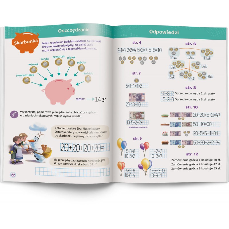 Znajomość pieniędzy i umiejętność ich liczenia jest niezbędna od najmłodszych lat. Dlatego właśnie powstała ta książka. Dzięki niej dzieci mają możliwość zapoznania się z polskimi monetami i banknotami. Można w niej znaleźć ćwiczenia rozwijające umiejętność liczenia pieniędzy. Dołączone do książki tekturowe monety i banknoty można wykorzystać do ćwiczeń lub poza nią, w zabawie. W drodze po miano eksperta od pieniędzy towarzyszą znane postaci ze świata Disneya.