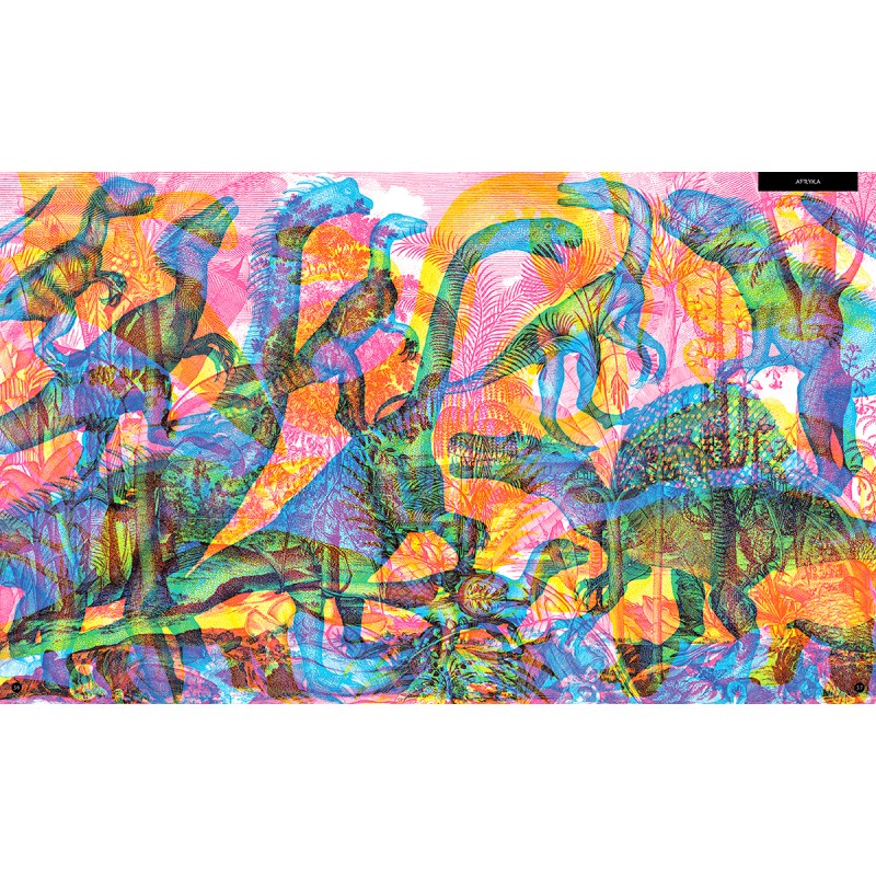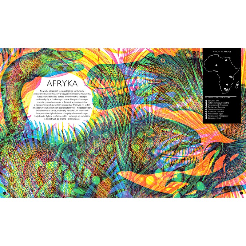 Każda z kolorowych ilustracji skrywa w sobie trzy „warstwy”. Obejrzysz je przez kolorowe filtry dołączone do książki. Przez czerwony zobaczysz dinozaury, przez zielony – ich środowisko życia, a przez niebieski – prehistoryczne rośliny i zwierzęta.