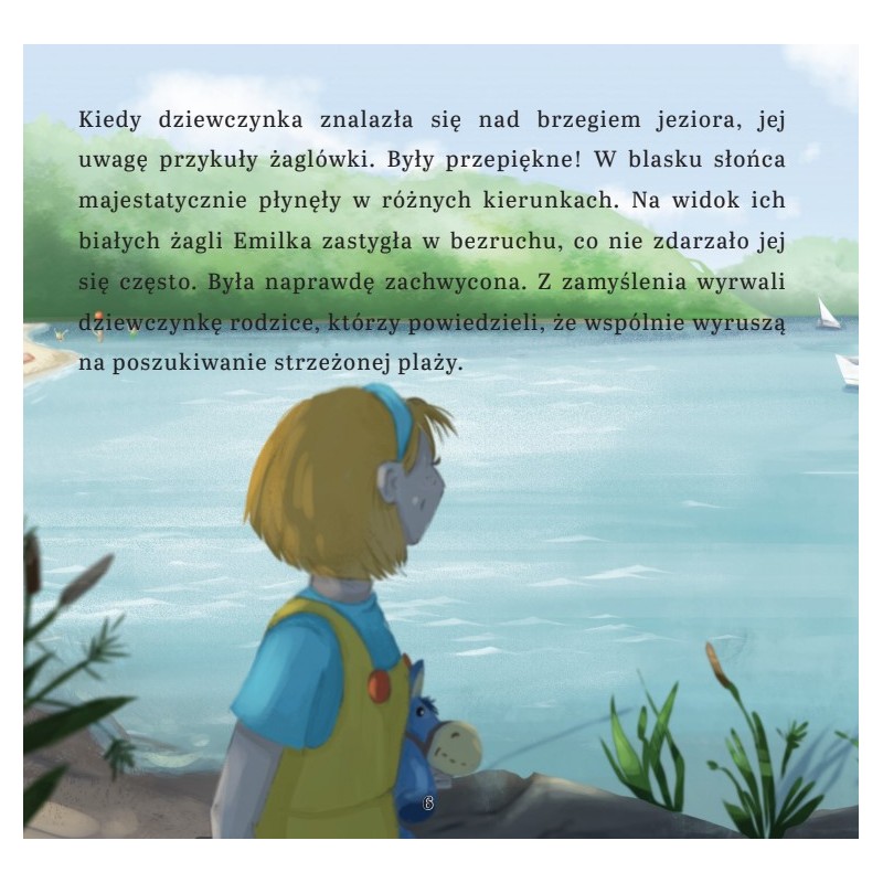 Emilka wraz z rodzicami jedzie na wakacje nad jeziorem! To prawdziwa frajda – obserwuje żaglówki, sunące po tafli jeziora, pod czujnym okiem mamy uczy się pływać, a także wybiera się wraz z rodzicami na przejażdżkę rowerem wodnym. Jednak podczas sielskiego pobytu nad wodą miała miejsce pewna bardzo niebezpieczna sytuacja. Chcesz wiedzieć, co się stało i czy udało się zapobiec nieszczęściu? Sięgnij po Emilkę nad jeziorem!