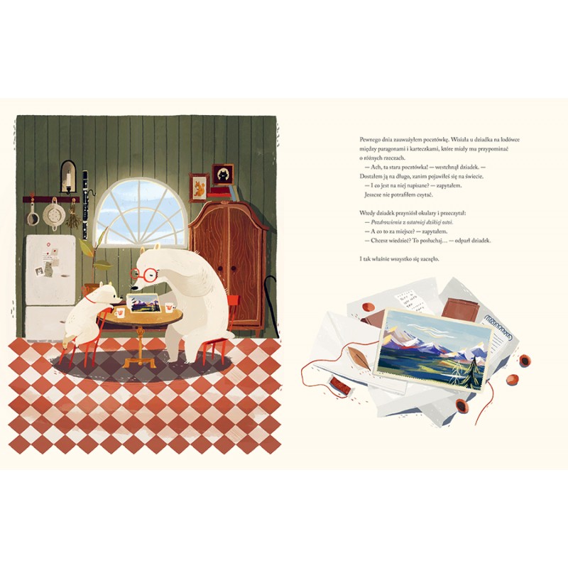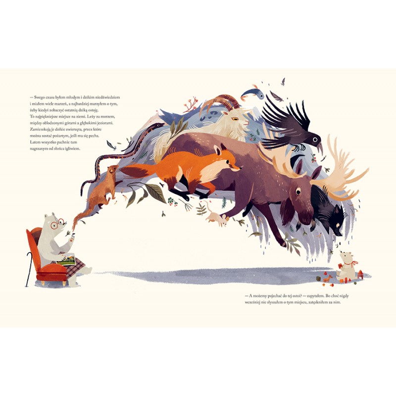 Wszystko zaczyna się od starej pocztówki wiszącej na lodówce dziadka wśród paragonów i karteczek. To pozdrowienia z najpiękniejszego miejsca na ziemi, które leży za morzem, między oblodzonymi górami a głębokimi jeziorami. Mały niedźwiedź i duży niedźwiedź wyruszają w daleką drogę. Szukają ostatniej ostoi — ostatniego dzikiego miejsca na ziemi. Czy jeszcze istnieje?
