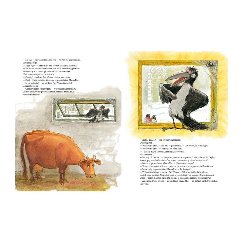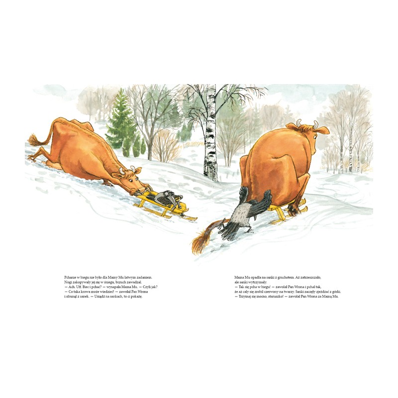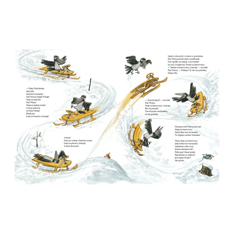 Wystarczy jednak zasugerować Panu Wronie, że czegoś nie potrafi, a od razu zmienia ton. On, nie potrafi? Nie potrafi pokierować sankami? Brawurowy popis jego umiejętności kończy się oczywiście w zaspie. W śniegu ląduje też Mama Mu – i to właśnie, z całego jeżdżenia na sankach, najbardziej jej się podoba!