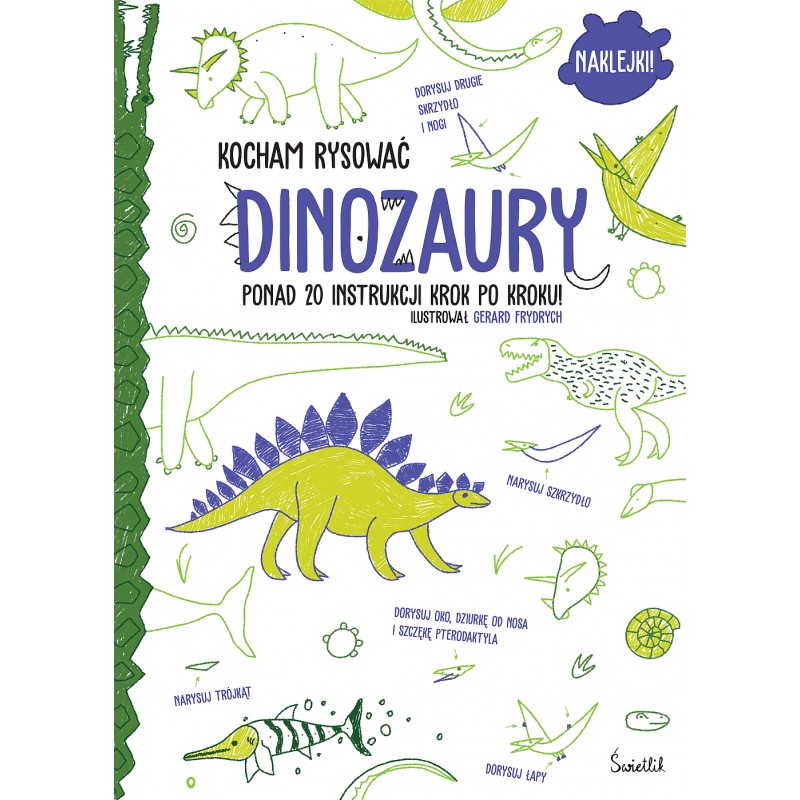 W środku „Dinozaury. Kocham rysować” czekają na was zadania do wykonania wraz z jasno opisanymi poleceniami, jak narysować poszczególne gatunki dinozaurów. Nie potrzebujecie dodatkowych kartek, jedynie ołówek lub kredki, aby stworzyć fantastyczny rysunek! Dodatkowo w książce znajdziecie naklejki do ozdabiania swoich rysunków.