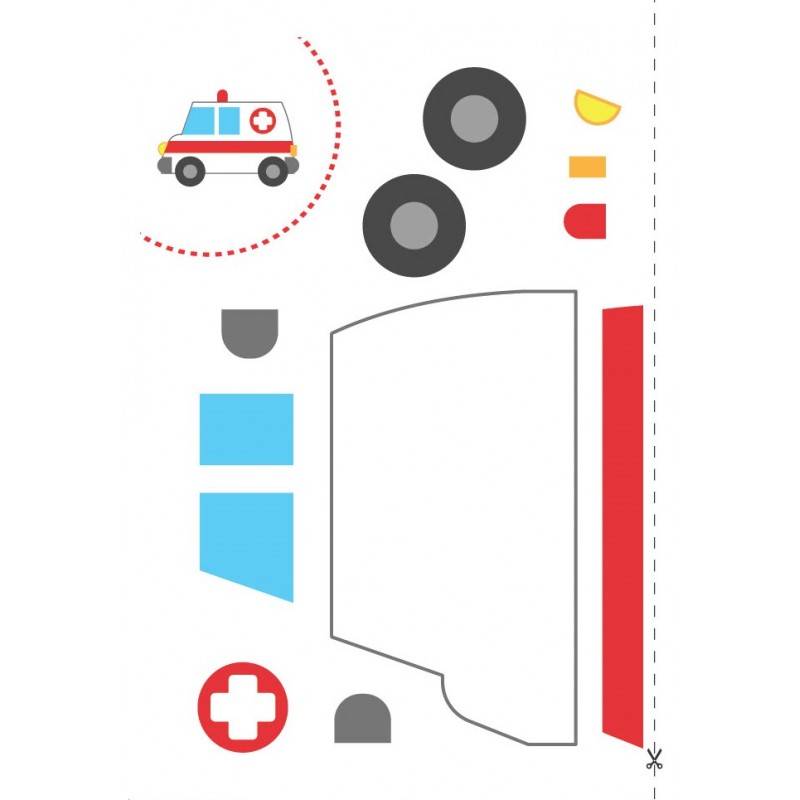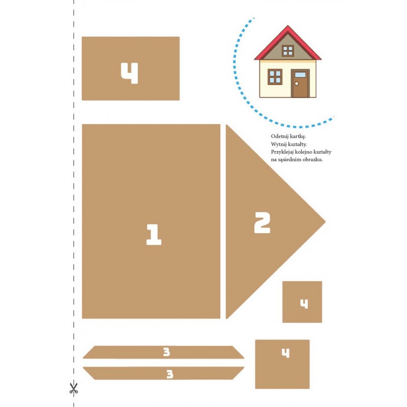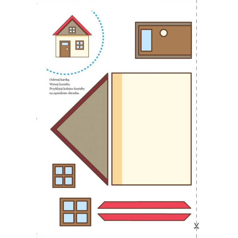 W książce dziecko wycina i nakleja elementy, tworząc z nich: dom, drzewo, mysz, psa, autobus, ambulans, dziewczynkę, chłopca.