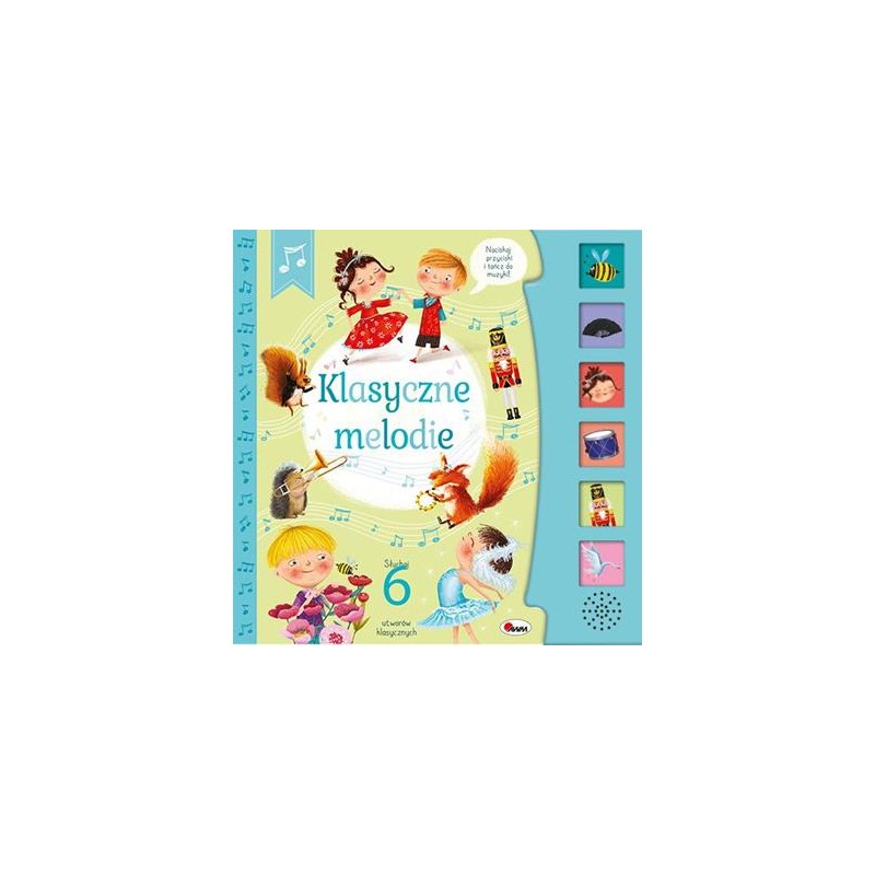 ILUSTRACJAMI. Książkę wyposażono w PANEL DŹWIĘKOWY. Po naciśnięciu przycisków maluszek usłyszy KLASYCZNE MELODIE.